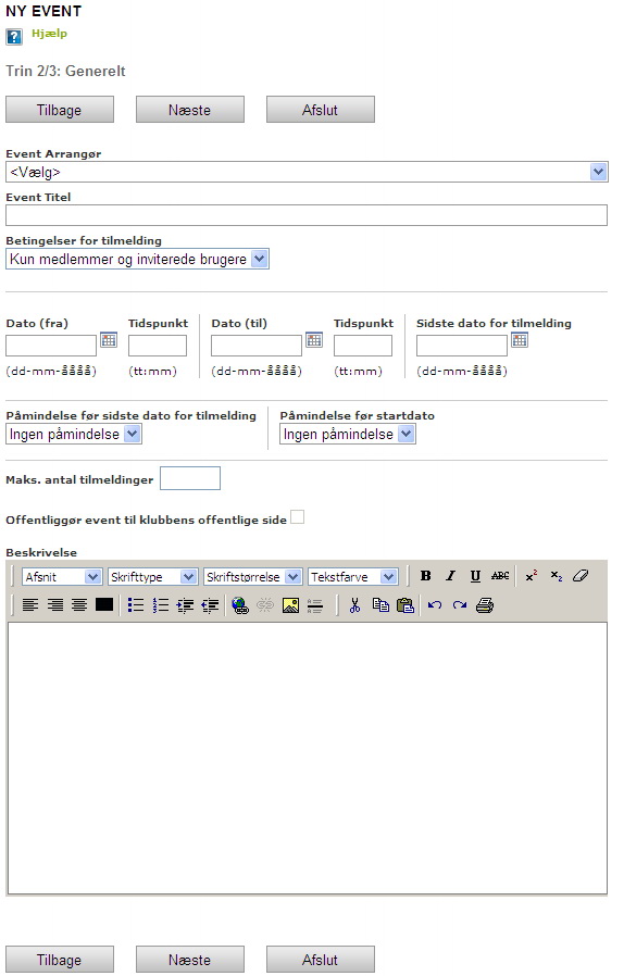 NOTE! It is important to ensure that the "Organiser" is set to the club or group, for whom the event belongs to. The event will then automatically be shown under "Events" for that club or group.