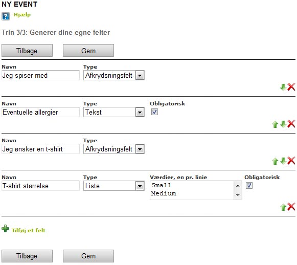 On the last step you have the option to create more fields for the event, which have to be completed by those who register. This is done by clicking "+ Add a field". Examples of the optional fields could include: "Are you participating in shared transport" or "What size t-shirt do you need". An unlimited amount of fields can be generated, and there are several types to choose from.