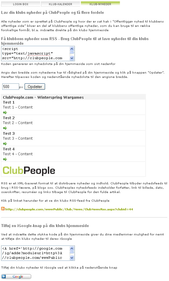 The tab "club news" contains the code to get your club's news shown directly on the club's own website, and iGoogle.