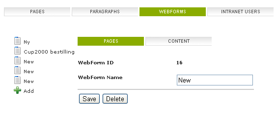 After entering the Webform name, you can save the webform by clicking on the "Save" button or delete the webform by clicking on the "Delete" button.